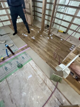 断熱工事が終わり、壁、天井の下地→ボードを貼り終え、床(無垢材)を貼る作業中