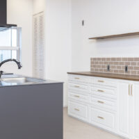 キッチンはアイランドキッチンにすることで、動きやすく、広々使えます。造作背面収納も奥様と大工で一緒に仕上げたもの。とっても可愛らしく、奥様も大変喜んでくださいました。